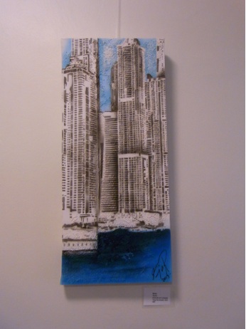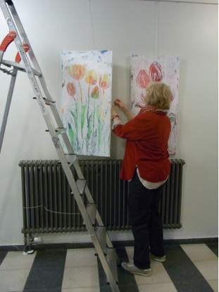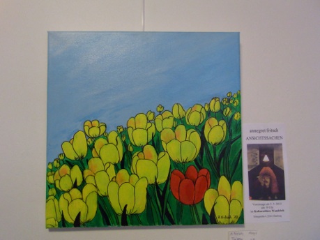 Auch in diesem Jahr haben sieben großartige Maler und Malerinnen den Eingangsbereich zum Kulturhof mit einer Ausstellung bereichert. Zum Beispiel oben links: Sylvia Pfenningwerth; oben rechts: Ulrike Denning: mitte links: Annegret Fritsch; unten links: Tanja Rychlowski.