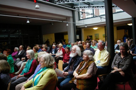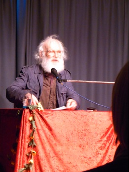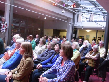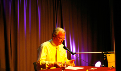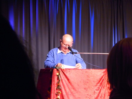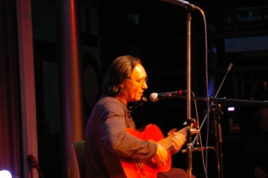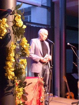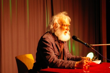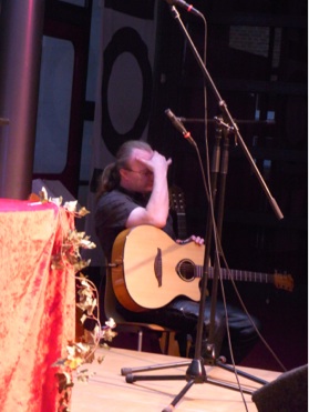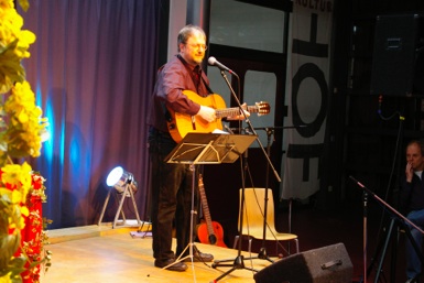 Links: Crazy Joe begeisterte zwischen den Texten auf der Gitarre. Mitte: Christoph Hachmann (gleichzeitig unverzichtbarer Technik-Chef) faszinierte das Publikum mit Gitarre und Gesang. Rechts: Hans Jürgen Plaumann, Mitinitiator der WortFlugZone, amüsierte sich königlich. Fehlt noch Thomas (Thommes) Siebert, der Mann am Klavier - hier auf Foto-Seite 2.